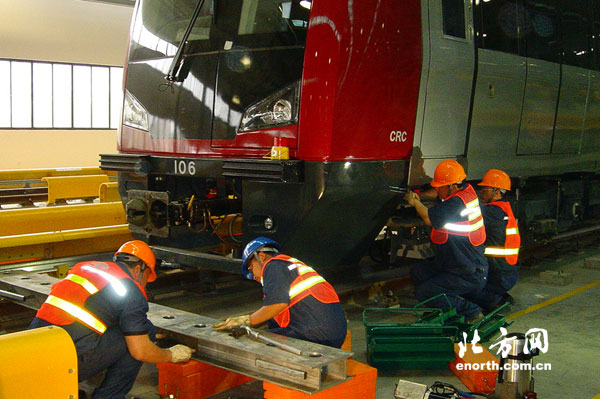 工作人员对列车进行维修