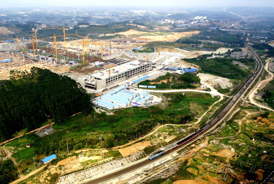 图为一列火车从正在建设的南宁东站旁经过(3月1日摄)。新华社记者周华摄