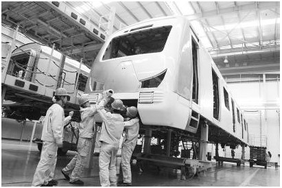 3月5日,成都南车轨道车辆有限公司生产线工人正组装调试“成都造”地铁列车。 本报记者 衡昌辉 摄