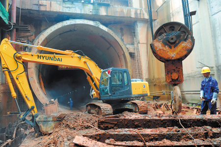 南湖路湘江隧道双线贯通后,建设者正在进行东入口施工。均为余志雄摄