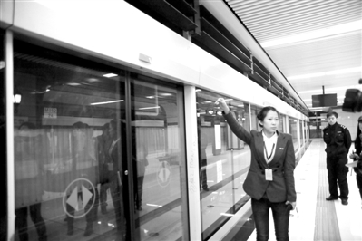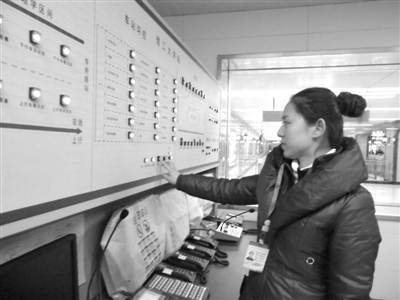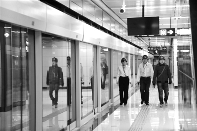 在车控室内,行车值班员吴青梅正在行车值班表格上填写刚刚经过此站地铁列车的出站时间和入站时间,在她面前是一个装有近百个红、绿按钮的综合控制盘,行车值班员坐在这里,就可通过地铁车辆信号、安全门、车站环控、隧道通风等几方面的指示灯显示,监控地铁车站、地铁车辆是否存在异常情况。同时,通过桌面上站间电话、行调电话、环调电话、电调电话等不同分工的6部电话,进行不同情况的业务办理;在地铁车辆经过时,值班站长张慧敏认真辨听地铁经过车站时是否有杂音、看开关门作业、安全门指示灯是否正常,并在地铁经过后,用对讲机向车控室上报车辆到站和出站的时间;在地下第二层的站台层,站台站务人员彭琳与同事一起,在站台进行巡视,监控列车运行状态,查看站台设备设施情况,以保证站台及地铁车辆安全运行。