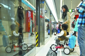 5日,一个小女孩在妈妈的陪同下,骑着小车来到10号线丰台站乘坐地铁。本报记者 和冠欣摄