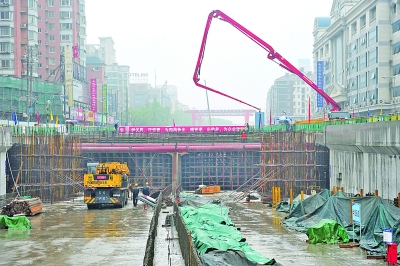 昨日,在城西干道水西门隧道北段的入口处,施工人员正在冒雨进行暗埋段沿口的混凝土浇筑。南京市住建委城市建设处处长龚成林介绍,该隧道的北段敞口段已完全成型,基本就差最后一道铺沥青工序。