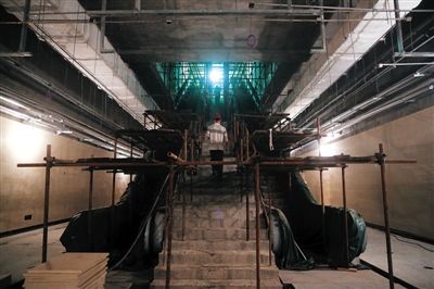 昨日,地铁9号线军事博物馆站与1号线的换乘大厅正在施工中,计划11月底投入运营。新京报记者 侯少卿 摄