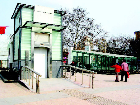 据新华日报消息:在南京地铁鼓楼站区,一个方柱形建筑引来行人好奇的目光,据了解这是专供残疾人轮椅进出地铁站的箱式电梯,直通位于地下负三层的列车站台。