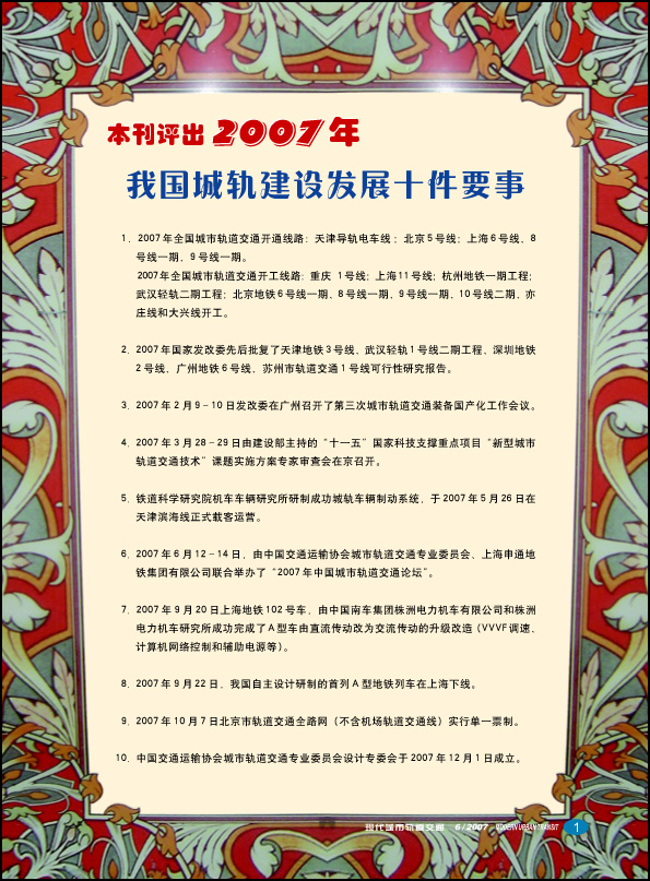 《现代城市轨道交通》杂志评出:2007年我国城轨发展十件要事