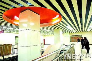 “太空舱”———这是记者对“金台夕照”站厅装修的直接印象。宽阔站厅内,两侧墙壁如括号般向内弯曲形成类似机舱的形状。除了地面之外,无论墙壁还是天花板,圆形白光灯池和橘红色色块如密集的气泡一样分布,大的直径可达1米,小的直径才20厘米左右。面对如此现代风格的设计,“金台夕照”仿佛被赋予了新的生命。