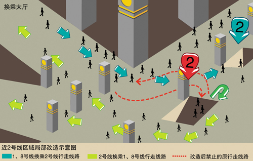 届时,虽然由2号线换乘1、8号线的乘客需要比最近路线多走二三十米,但可以避免客流对冲,提升换乘的安全系数。