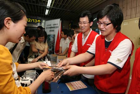 据新华社消息:5月22日,上海地铁公司团员青年在地铁徐家汇车站义卖地铁纪念磁卡。由上海地铁公司赶制的这批印有抗震救灾画面的纪念磁卡共2万套,无面值。乘客捐款20元以上就可得到1套。当天,上海地铁公司的团员青年在地铁沿线的6个车站开展了磁卡义卖活动,义卖所得全部款项将捐给四川地震灾区。