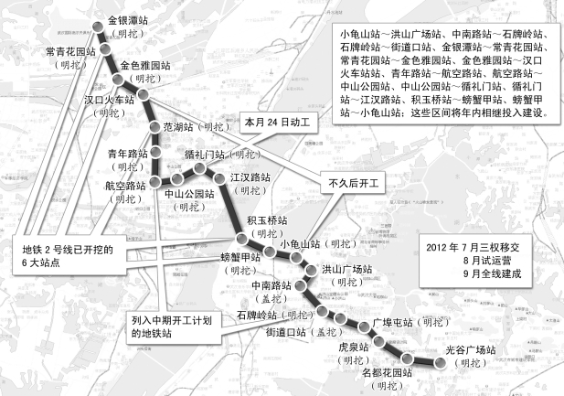 据长江商报消息:家门口的地铁站何时开挖,何时完工?是采用明挖还是暗挖?昨日,记者从武汉地铁集团获悉了武汉地铁2号线一期工程整体工期规划图,市民所关心的问题在此图表上一目了然。这张工期策划图也是首次在媒体上公开。