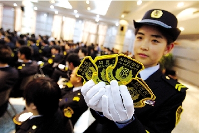 据京华时报消息:昨天,地铁工作人员展示新式制服和臂章。从今天起,地铁1号线、2号线、13号线和八通线的地铁员工将全部更换07式制服。新制服色彩选用深藏蓝色,不同的臂章表明不同的岗位。