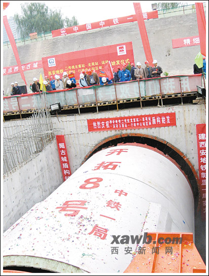 据西安晚报消息:10月19日上午,西安市地铁建设中最先服役的“开拓八号”盾构机再披战袍,开始新一轮盾构施工。至此,西安市地铁2号线建设全段,已有6台盾构机同时参与隧道施工。