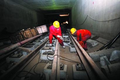 昨日,记者在隧道中看到,几个工程技术人员正在使用水平尺进行轨道的检测,这种检测需要每5米进行一次,轨道宽度的误差要保持在2毫米之内。