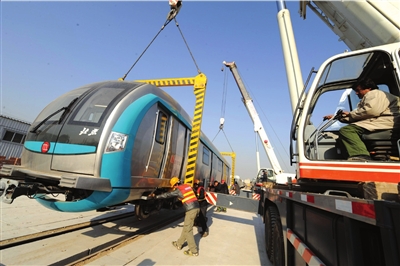 昨天10时许,一辆装载4号线列车的平板车缓缓驶入马家堡车辆段。车辆停稳后,两辆吊车分别从前后将车厢吊下平板车,放置在轨道上,随后由牵引车将车辆拉到停放地点。目前,地铁4号线第一批12节车厢已经全部到京,陆续还会有车辆进京。