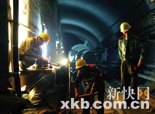 地铁5号线珠江新城站内,工人正在加紧安装隧道中的疏散平台。