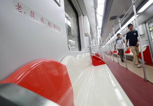 上海轨道交通11号线列车座椅的设计中融入上海市花白玉兰的元素(6月25日摄)。