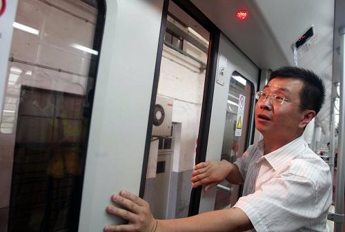 6月25日,工作人员在调试上海轨道交通11号线首列列车的应急门。