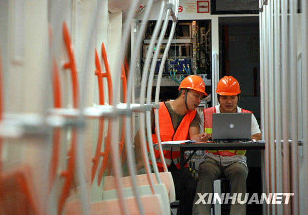 7月7日,技术人员正在上海地铁7号线新车上进行动车信号调试