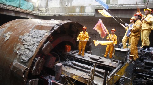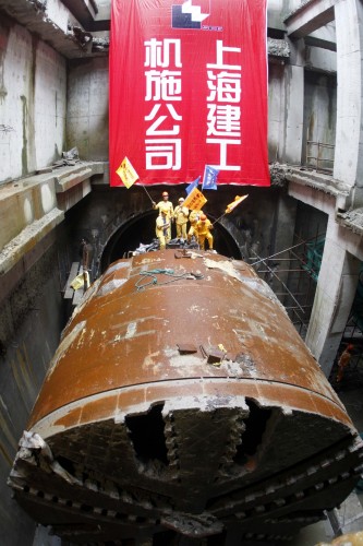 7月30日,上海建工机施公司的建设者欢庆地铁13号线世博专线贯通。
