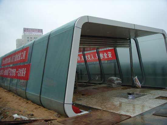沈阳地铁一号线的出入口造型是从十余个待选方案中筛选出来的,模拟地铁列车这一主题,把地铁的速度与时代感再现到地面建筑上。