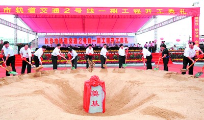 在昨日举行的长沙地铁2号线一期工程开工仪式上,省市领导张春贤、周强、于来山、杨泰波、陈润儿、蔡力峰、韩永文、石玉珍、张剑飞等正为基石培土。周柏平摄