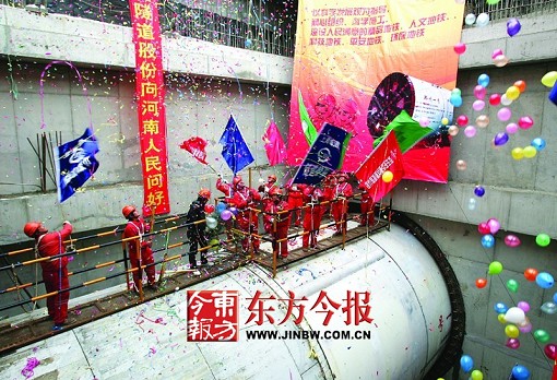 昨天上午10时许,郑州市金水东路与东风东路交叉口西南角,地铁1号线七里河站施工现场。随着“郑州1号”盾构机的启动,“郑州轨道交通第一块管片”从地面被吊运到基坑地下二层的施工区,通过已经铺好的铁轨运送到盾构机前端。6块管片相互咬合将组成一个隧道的支撑体。此时,开足马力的“郑州1号”,橘红色的巨型刀盘开始旋转,在巨大的推力下,向隧道作业面缓缓推进。未来四个多月,它将和“郑州2号”一起交替着向西北方向1000米以外的农业东路站掘进。