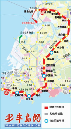 王亚军说,根据国家批复的青岛市轨道交通建设规划,一期工程为M3线,目前已奠基开工,二期工程为M2线,现正在进行前期论证工作,拟跨越李村河段采用高架形式,但具体建设方案尚未最终确定。据介绍,目前二期工程已进入前期方案设计阶段,地铁2号线初定在香港路至燕儿岛路路口处规划设置一处地铁站。