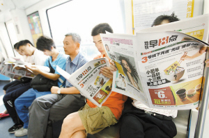 乘客在地铁3号线的车厢里阅读《地铁早8点》