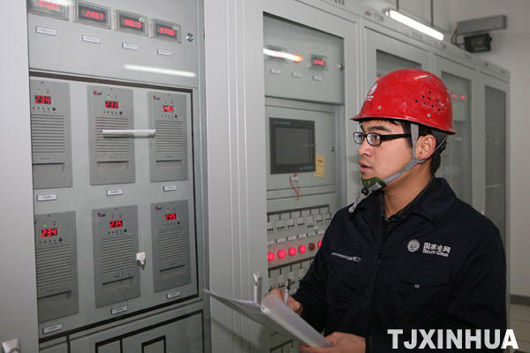 12月13日,国家电网的工作人员在控制屏前做记录。