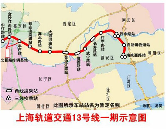 据了解,轨道交通13号线一期工程线路全长约为16公里,全部为地下线,线路途经上海市嘉定、普陀、闸北、静安4个行政管辖区。一期工程共设14座车站,全部为地下站,分别是华江路站、金沙江路站、丰庄站、祁连山南路站、真北路站、大渡河路站、金沙江路站、隆德路站、武宁路站、长寿路站、江宁路站、汉中路站、自然博物馆站、南京西路站。