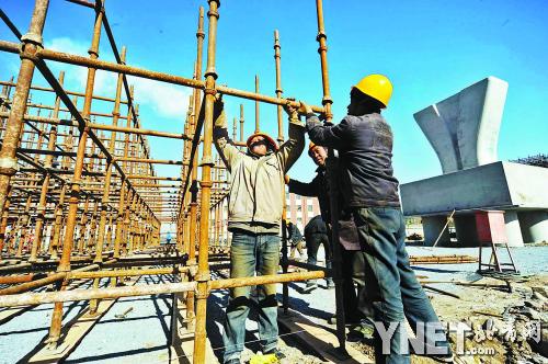 记者在现场看到,一排整齐的桥墩矗立在永定河河床中,工人们正在进行箱梁“排架”搭设施工,“排架”搭设完成后,将在上面修建施工平台,进行大桥箱梁的“浇筑”施工。