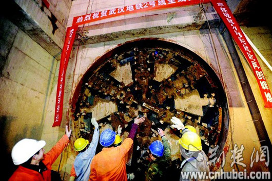 昨晚8时许,武汉地铁2号线王家墩东站的地连墙(车站围护结构)被凿开,在地下潜行3个月的盾构机露出刀盘。至此,王家墩东站至青年路站区间左线隧道正式贯通,也标志着武汉首条地铁线路、我国首条穿越长江的地铁线路——全长27.7公里的地铁2号线一期工程全线贯通。“地铁贯通啦!”现场近20名工人欢呼起来,还有人放起鞭炮。操作盾构机掘通最后一段隧道的王宝林兴奋地告诉记者:“想不到是我最后挖通了地铁2号线!”