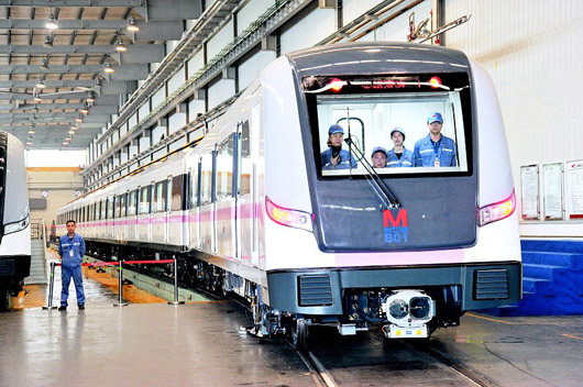 楚天金报讯 图为:昨日上午10时许,武汉地铁2号线首辆列车——B016缓缓驶出总成车间 (记者万多摄)