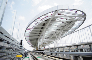 三叶草屋顶安装是属于土建工程,中铁十六局的项目副经理张强介绍:“三叶草屋顶的面板叫铝镁锰合金板,它本身是防锈的,还要涂抹防锈漆,其顶部色彩用飞机灰,面板强度大,抗风吹的能力强。”