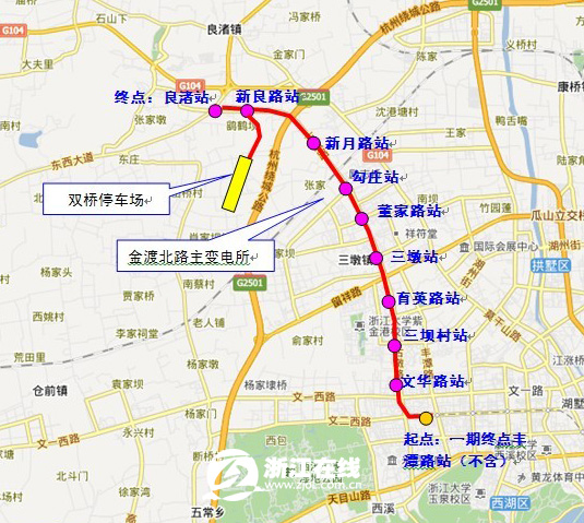 地铁2号线二期工程起于一期工程终点丰潭路站,依次沿着文二西路——古墩路地下敷设,最后止于良渚新城的良渚站。线路全长约12.8km,全部是地下线,设车站9座。其中换乘站3座,分别是与5号线换乘的三坝村站,与4号线换乘的勾庄站,与瓶窑市域线换乘的良渚站。