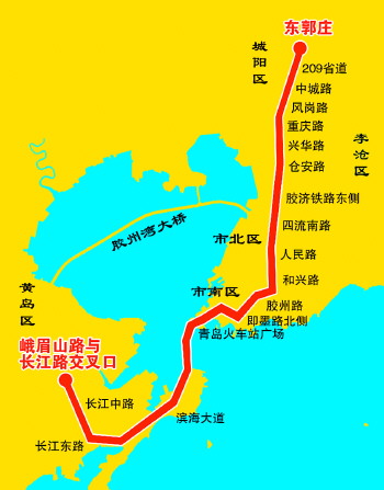 在线路走向上,1号线起自黄岛区峨眉山路与长江路交叉口,跨海进入青岛主城区,然后北上止于城阳区东郭庄,串联起黄岛区、市南区、市北区、李沧区、城阳区5个区。线路全长60.1km,共设车站39座(见示意图)。