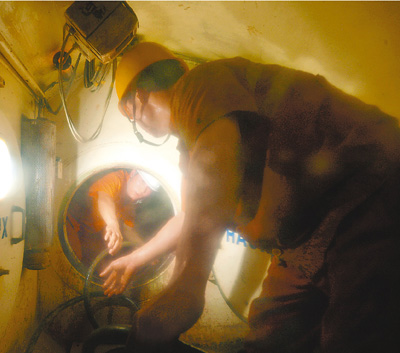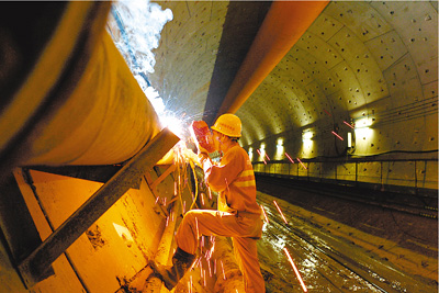 7月21日,工人们进入盾构压力舱动火修复刀盘。