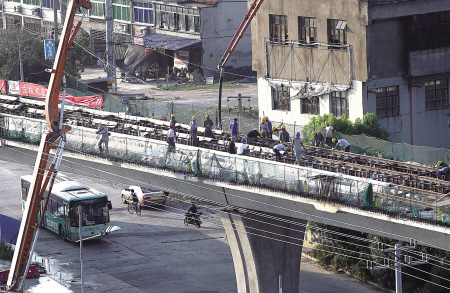 昨天下午,施工人员在宁波轨道交通1号线一期工程高架段散铺铁轨。目前,轨道交通1号线一期工程起于徐家漕站、终至高桥西站全长约6.5公里的高架段铺轨全面展开,计划在年底贯通。