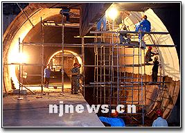 目前,随着我市地铁1号线即将全线轨通,地铁各地下车站正在紧张地进行站台装修施工。这是南京站地铁车站内,工人们在对站台两侧隧道进行表面涂装施工。