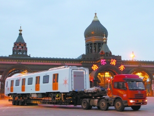 10月14日,国内首列耐高寒地铁车第一批车厢运抵哈尔滨。 新华社发(王忠岩摄)