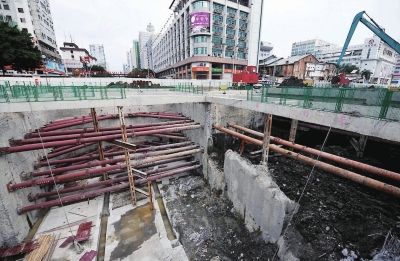 目前,东街口站正在进行主体施工,开挖深度已达到16米。因为要结合换乘段施工,该处要挖到24米。