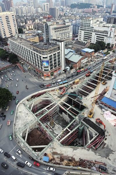 地铁东街口站位于市中心,设计为地铁1、4号线换乘车站。此次,结合1号线车站主体施工的还有1、4号线换乘段。