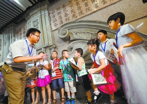 昨(14日)天,地铁4号线“儿童大学”正式开讲,孩子们在专业老师的带领下探访地铁沿途的北京大学、清华大学等高校的古建筑,学习建筑知识,了解古都历史。本报记者 吴镝摄