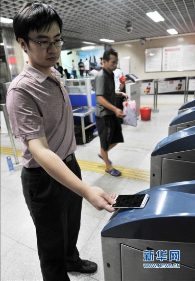 7月22日,一位男士在刷手机乘坐地铁。当日起,北京市持有中国移动认证的NFC(近距离无线通讯技术)手机的客户,可实现刷手机乘公交、地铁和超市餐饮的小额消费功能。据介绍,中国移动用户需在指定营业厅办理NFC一卡通专用SIM卡后才可享受该服务。该服务目前支持北京市所有的公交线路、地铁线路,并可应用在支持北京市政交通一卡通消费的商铺。新华社记者 李文 摄