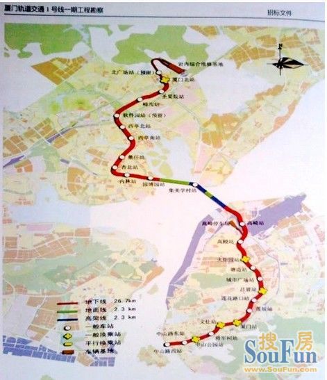 根据规划,厦门地铁1号线一期,拟设24个车站,预计2016年12月31日全线通车试运营。据国家环保部环评公示显示:厦门地铁1号线一期工程南起中山路南侧,与中山路并行向东以地下线方式铺设,穿越中山公园以南地块后沿文园路转向东北,经湖滨中路、湖滨南路后转入嘉禾路,并沿嘉禾路、规划海堤路向北,于高集、集杏海堤以地面、高架方式跨海;跨海后以地下方式沿杏前路、杏林北路至集美新城,沿规划纵八路向北穿越沈海高速,并沿规划珩山街、珩田路延伸至厦门北站,终止于厦门北站北广场。