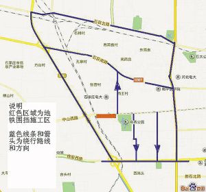 红色区域为地铁围挡施工区 蓝色线条和箭头为绕行路线和方向