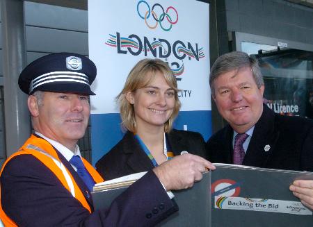 11月29日,英国奥运金牌选手莎拉·韦伯(中)以及英国奥申委首席执行官米尔斯(右)在英国伦敦斯特拉特福德地铁站,在该站支持申奥的签名簿上留言。当日,伦敦为申办2012年奥运会准备的地铁“申奥专列”举行首发式。此专列把伦敦市中心与2012年各个奥运场馆连接在一起。
