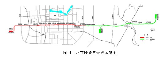 北京地铁五号线是贯穿京城南北的一条轨道交通干线,线路经过了丰台、崇文、东城、朝阳和昌平等五个区,全长27.6km,共设车站22座。根据规划条件及环境要求,南段线路采用地下线路形式,在北四环路以北采用高架或地面线路形式,其中,地下线路长度16.9km,占全线长度的61%,地下车站16座;高架及地面线路长度10.7km,占全线长度的39%,高架车站5座,地面车站1座。(见图1)