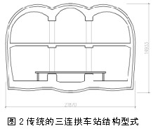 五号线连拱车站隧道施工采用的是中洞法,其中中洞采用交叉中隔壁法施工。施工过程中在拱部打设钢管棚,管棚间插小导管,并注浆以保证拱部稳定。连拱车站型式在以往工程中普遍反映出的问题主要有:施工质量不易保证;顶部连拱形成的沟槽积水,容易出现漏水现象,且不易治理;施工分块多,稳定性差;废弃工程量大等。
