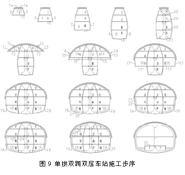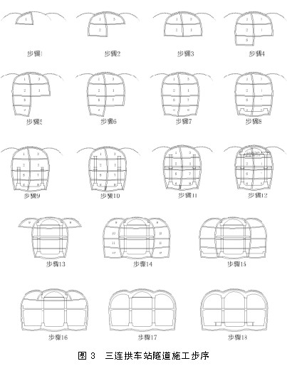 在天坛东门站和磁器口站,采用了传统的三连拱车站型式。隧道断面尺寸大致在22m×15m(宽×高)左右。车站采用复合衬砌结构型式,顶梁采用型钢梁,立柱为钢管柱,其它均为钢筋混凝土结构。此结构型式在北京已经有成功的实例。通常情况下,根据隧道断面的大小及跨径分配,可采用中洞法、侧洞法、侧壁导坑法以及混合使用各种工法分步实施开挖和支护作业。五号线采用的施工开挖步序见图3。